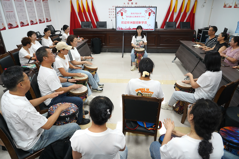 文艺表演结束后,现场教学环节热闹开启。声乐班中,老师耐心指导发音技巧,从基础音阶练习到歌曲情感表达,老人们听得专注、学得投入,不时传出欢快歌声与笑声;手鼓班内,老师亲自示范节奏要点,老人们认真模仿,激昂鼓点回荡教室,尽显学习热情。