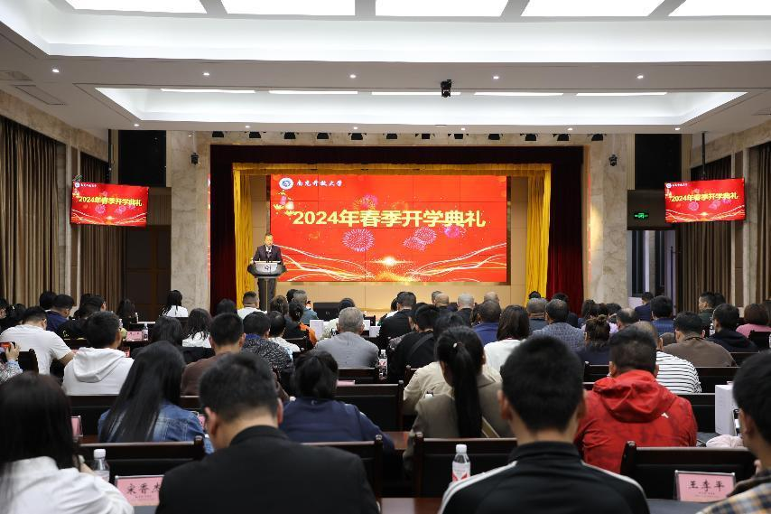 4月11日晚,南充开放大学2024年春季新生开学典礼在二楼多功能会议厅举行。学校党委书记、校长昝平出席典礼并致辞,学校党委委员、副校长曲阳主持典礼。直属部全体班主任、相关处室人员及150余名新生代表参加了典礼。