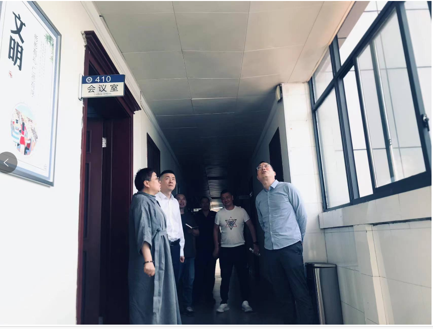 图为蒲晓波(右1)察看远程综合楼四楼楼道因顶棚龙骨松动导致顶棚下垂的隐患