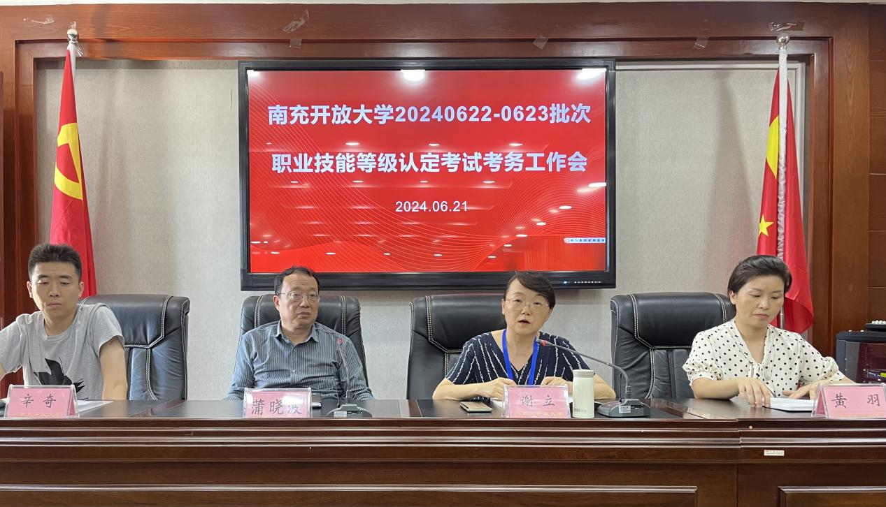 四川开放大学培训学院院长谢立、质量督导员辛奇参加了考务培训工作会。南充开放大学副校长蒲晓波主持会议并讲话,他再次强调了监考要求以及监考职责;谢立对此次职业技能认定考试提出了具体要求;南充开放大学社区教育处处长黄羽对此次考试工作作了业务培训。