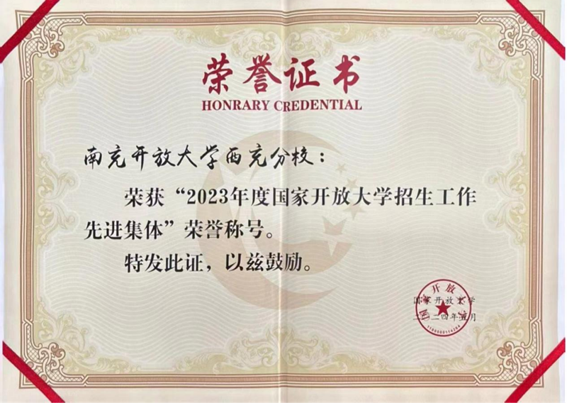 2024年上期,南充开放大学西充分校被国家开放大学授予“2023年度国家开放大学招生工作先进集体”荣誉称号。