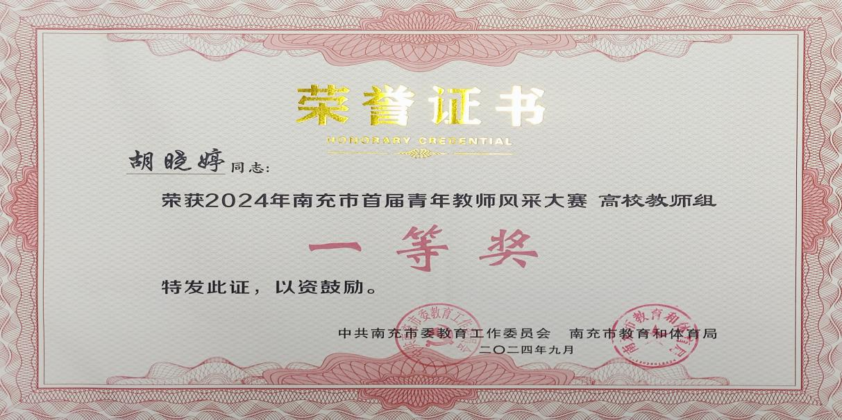 恰逢第 40 个教师节之际,我校再获喜讯,参加南充市首届青年教师风采大赛的两名青年教师斩获佳绩。其中胡晓婷老师荣获高校组一等奖,周雪老师荣获得高校组优秀奖。