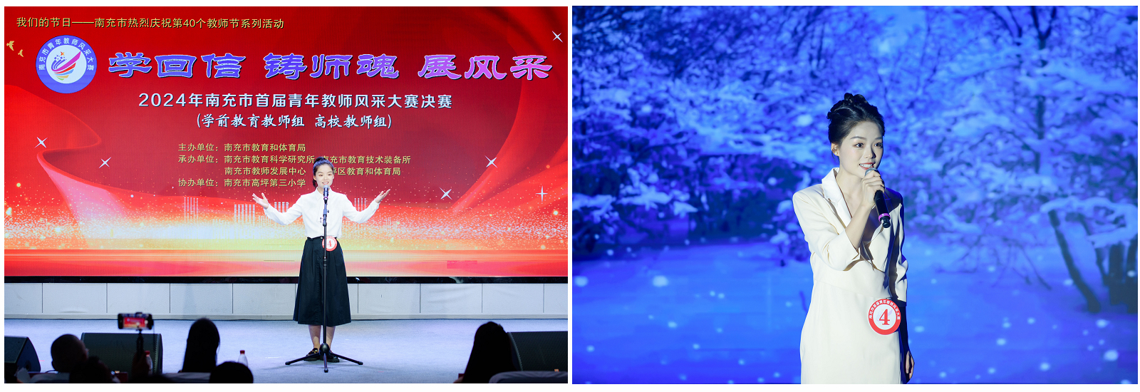 三是参加南充市庆祝第40个教师节暨首届青年教师风采大赛成果展演活动。胡晓婷老师由于在大赛中的优异表现,受邀参加9月10日晚举办的展演。这不仅是她个人的荣耀,更是南充开放大学全体教师的骄傲。我校青年教师取得的成绩,体现了她们日常工作中的积累与努力,也反映了学校对青年教师培养的重视。