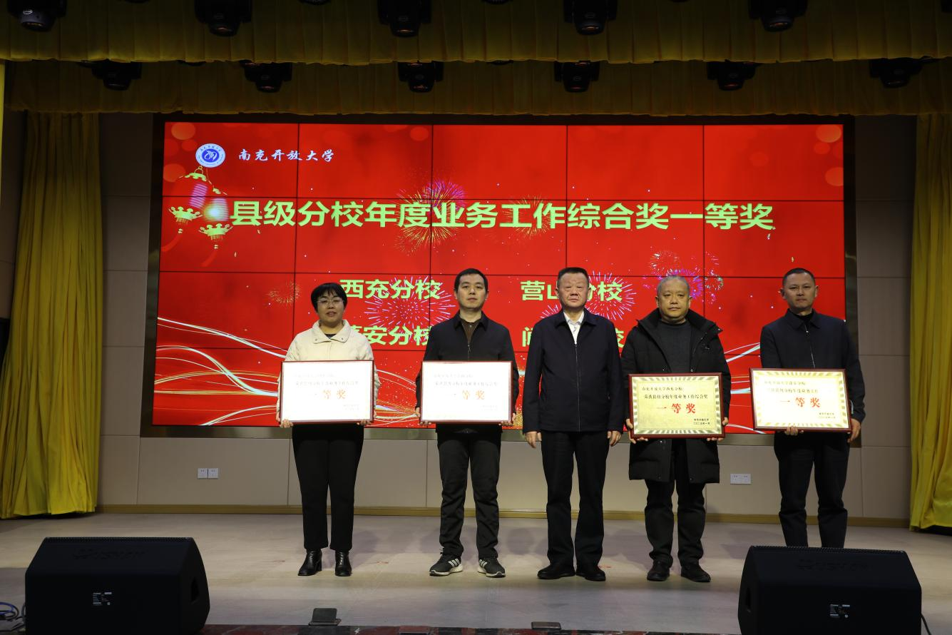 党委书记、校长昝平对我校2024年全市系统工作进行总结,指出,经过全市开放大学系统教职工的不懈努力,2024年我校各项工作取得了优异成绩,荣获2024年度全省市(州)开放大学、行业分校年度业务工作综合奖一等奖和2024年度全省创新办学特色奖;荣获2023年度国家开放大学招生工作先进集体。蓬安分校和阆中分校荣获先进县级分校奖;高坪分校荣获县级工作进步奖。