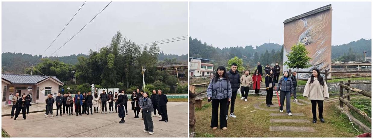 首先,师生一行来到西充县莲池镇天兴桥村参访。天兴桥村是全省乡村振兴重点帮扶优秀村,是一个以“治愈经济”为核心的特色农文旅融合发展村落。天兴桥村构建了动物救助、电商直播和农文旅产业三大融合发展板块,形成了多元产业融合的发展格局。村里有研学农场、农事体验、民宿接待等文旅项目,还有训犬师开办的“萌宠学院”、非遗传承人指导的蓝染和竹编体验,以及“充国蒸笼宴”等特色美食。该村由过去一穷二白发展到如今年接待游客达60万人次,农民收入不断增加,乡村建设越来越好,形成了人与自然和谐共生的美好图景。学员们纷纷表示这样的发展模式让人深受鼓舞和启发,也为如何带动自己家乡早日实现乡村振兴提供了很好的工作思路和努力方向。