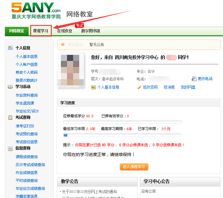 进入网络教室后,你们就进入了各自的学习主页,进行课程学习就点击"课程学习"选项(如下图红箭头所指示的选项)。进入"课程学习"后,你们就能看见各自要学习的课程了。学费全部交清的同学,你所有的课程都会开设出来,只交了一学年学费的同学,只有一半的课程出现在你的教室里。