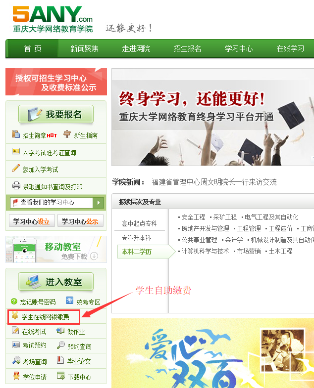 你们交费可以到南充电大来交,也可以自己在学习平台上交,自己在学习平台上交,请点击学习平台首頁上"学生在线网银交费"选项进行交费。如下图所示: