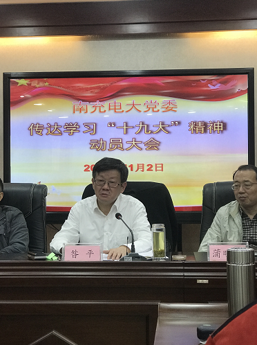 11月2日,南充电大召开传达学习“党的十九大”动员大会,会上,南充电大党委书记昝平传达了《中共南充市委关于认真学习宣传贯彻党的十九大精神的通知》。文件要求充分认识党的十九大开创性、里程碑和划时代的重大意义,切实增强学习宣传贯彻党的十九大精神政治自觉思想自觉行动自觉。迅速在全市教育系统掀起学习宣传热潮,切实用习近平新时代中国特色社会主义思想武装广大师生头脑。认真落实党的十九大提出的任务要求,全力谱写教育事业改革发展新篇章。切实加强组织领导,确保学习宣传贯彻党的十九大精神取得扎实成效。