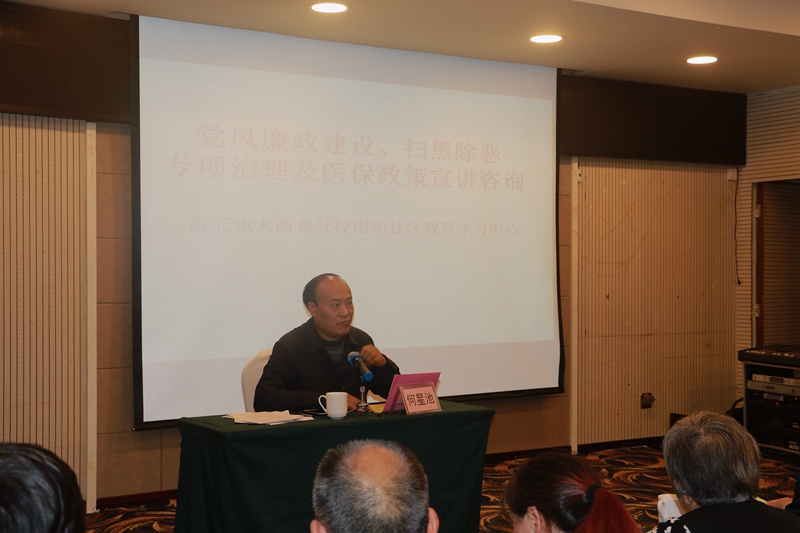 为了让社区居民进一步了解党风廉政建设、扫黑除恶专项治理和医保政策,2018年10月16日,南充电大西充分校在南街社区组织了专题宣讲咨询活动。本次活动由西充分校主办,西充县医保局和晋城镇南街社区承办,参加活动的有110余人,南充电大负责社区教育的领导莅临宣讲咨询活动指导,活动圆满成功。