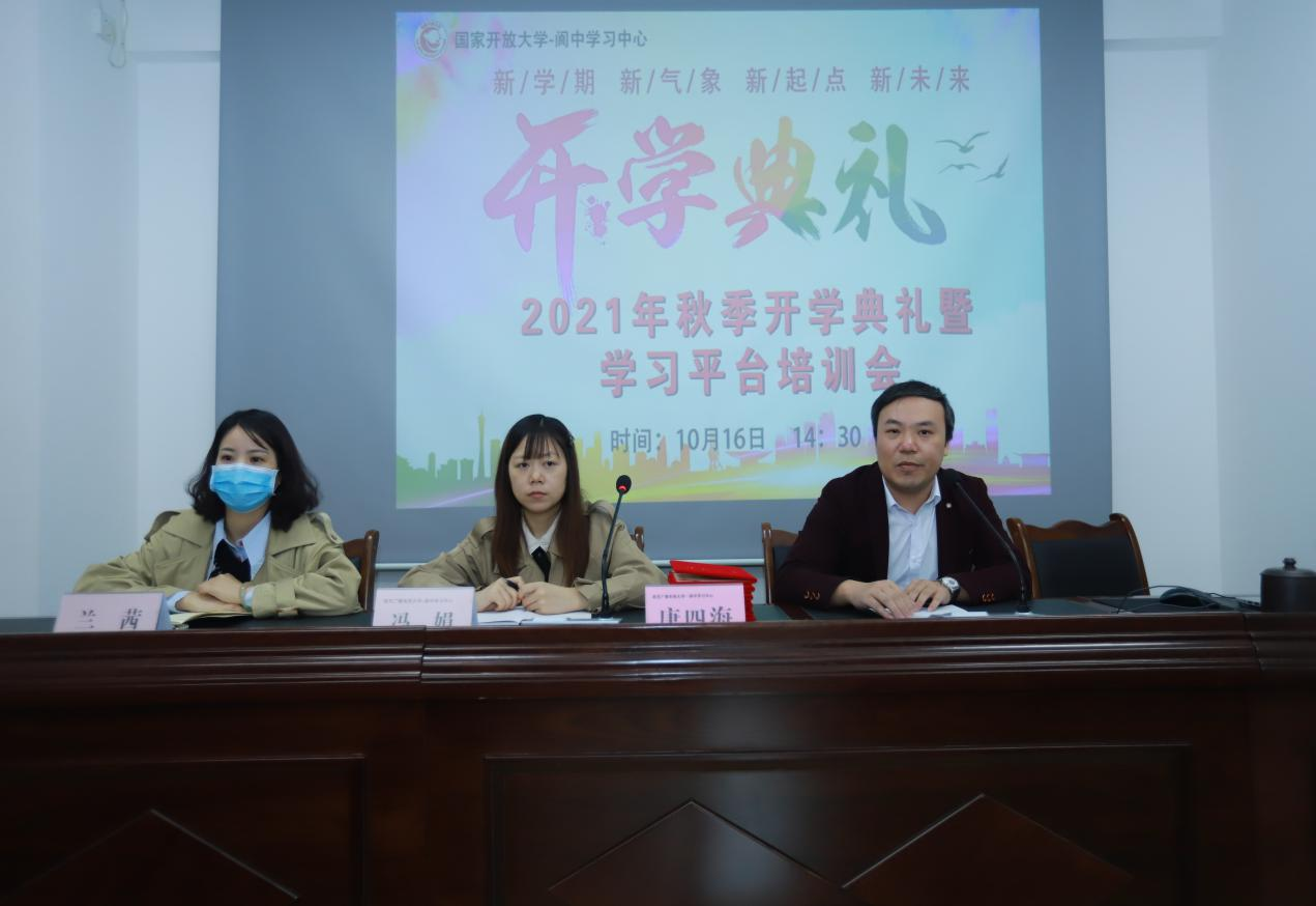 在这丹桂飘香、秋风送爽的时节,南充开放大学阆中学习中心于2021年10月16日,举行了2021秋季新生开学典礼。学习中心唐四海副主任以及各班主任老师出席了开学典礼。