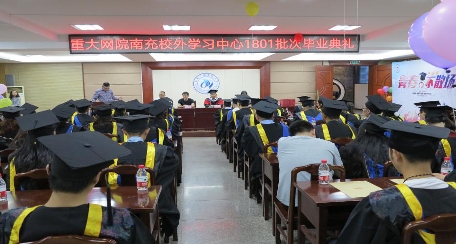 时逢立夏,还不灼热的阳光,早早点燃了毕业生的激情。在5月5日晚上7:00时正,重庆大学网络教育学院南充电大校外学习中心在学术厅隆重举行了1801批次毕业生的毕业典礼,毕业典礼由学习中心负责人易新主持,在大家满怀深情高唱《国歌》的歌声中拉开了帷幕。