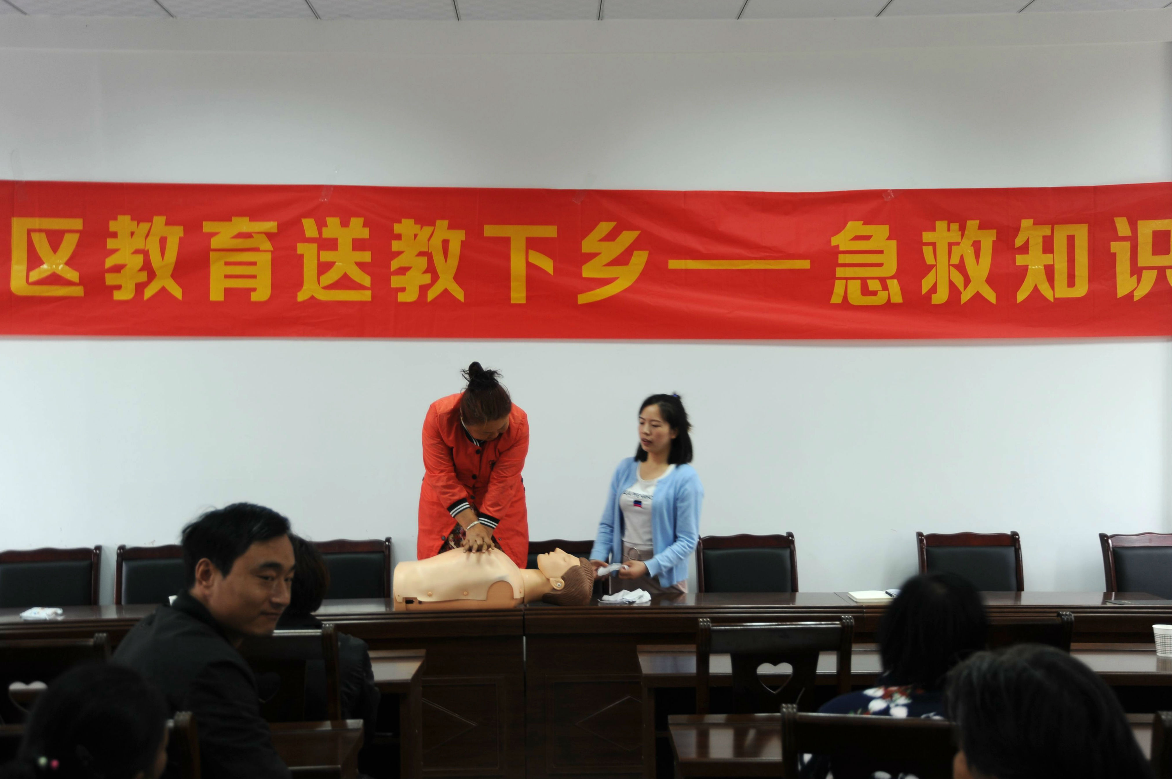 村委会办公楼刚刚落成,我校捐赠的会议室桌椅崭新锃亮,羊角山村一百多位村民扶老携幼坐满了会议室,大家聚精会神,专心聆听,唯恐漏掉一个字;有的村民还带来笔记本,认真记录,以备急用;在心肺复苏术实际操作环节,村民们更是积极踊跃,争相上台练习。村民们纷纷表示,老师的讲解生动有趣,培训过程轻松活泼,大家对急救知识有了一次全新的体验,活动很有意义,真的受益匪浅。(曲阳 黄羽)