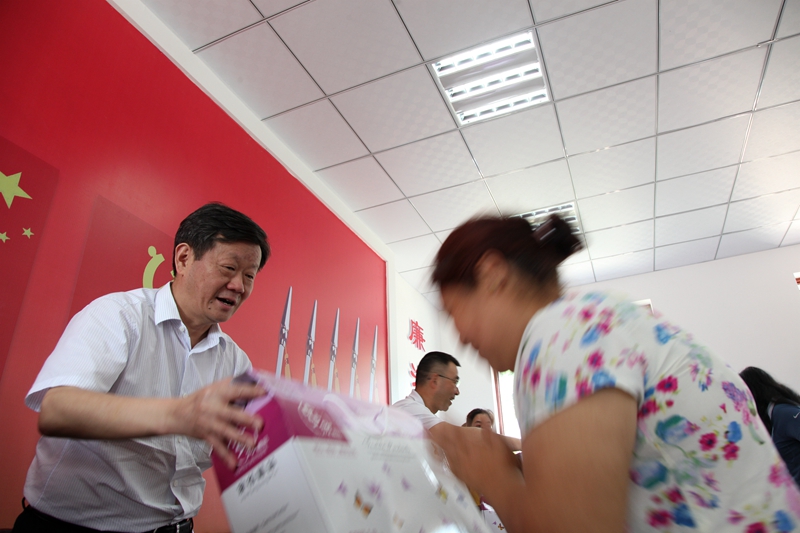 在羊角山村,校党委书记、校长、校精准扶贫领导小组组长昝平,为村民们赠送端午节慰问品。