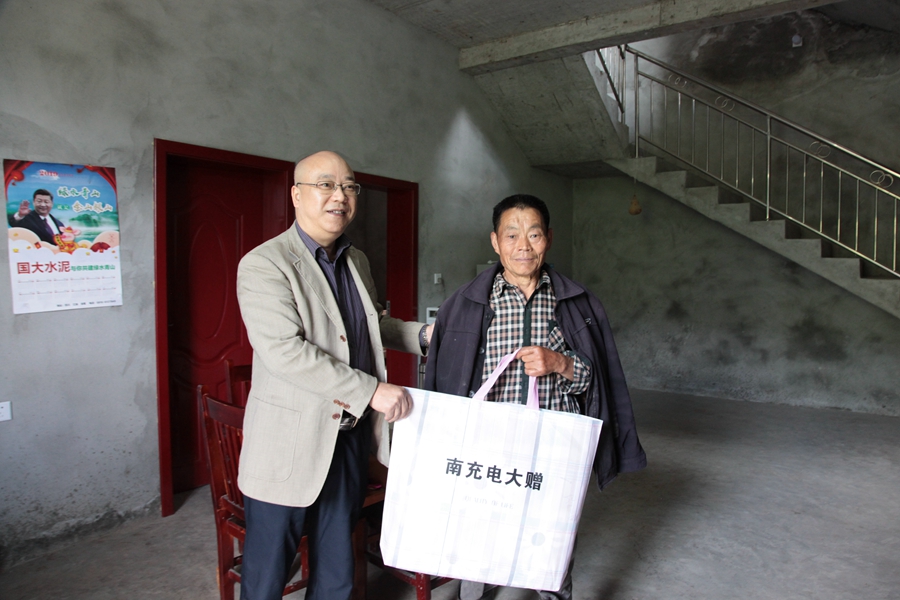 南充电大副校长蒲晓波(左)向村民赠送慰问品