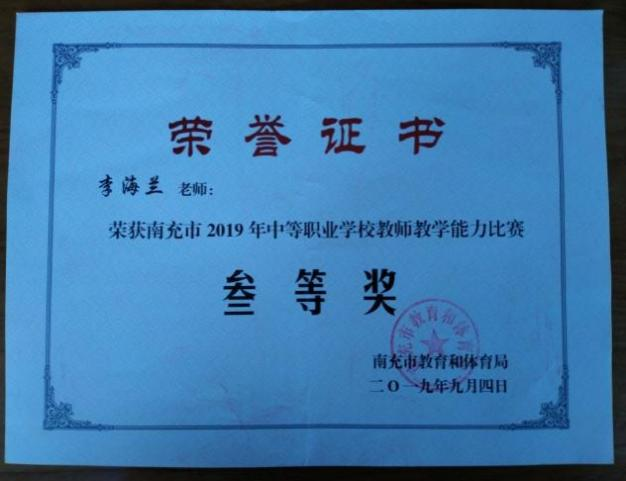 她是南充外国语中等专业学校的一名教师,平常教学任务非常繁重,但是她始终以饱满的热情投入工作。2018年她被评为校优秀教师,2019年获得南充市中等职业学校教师教学能力比赛叁等奖,2021年在南充市中等职业学校优秀论文评选活动中,荣获贰等奖。