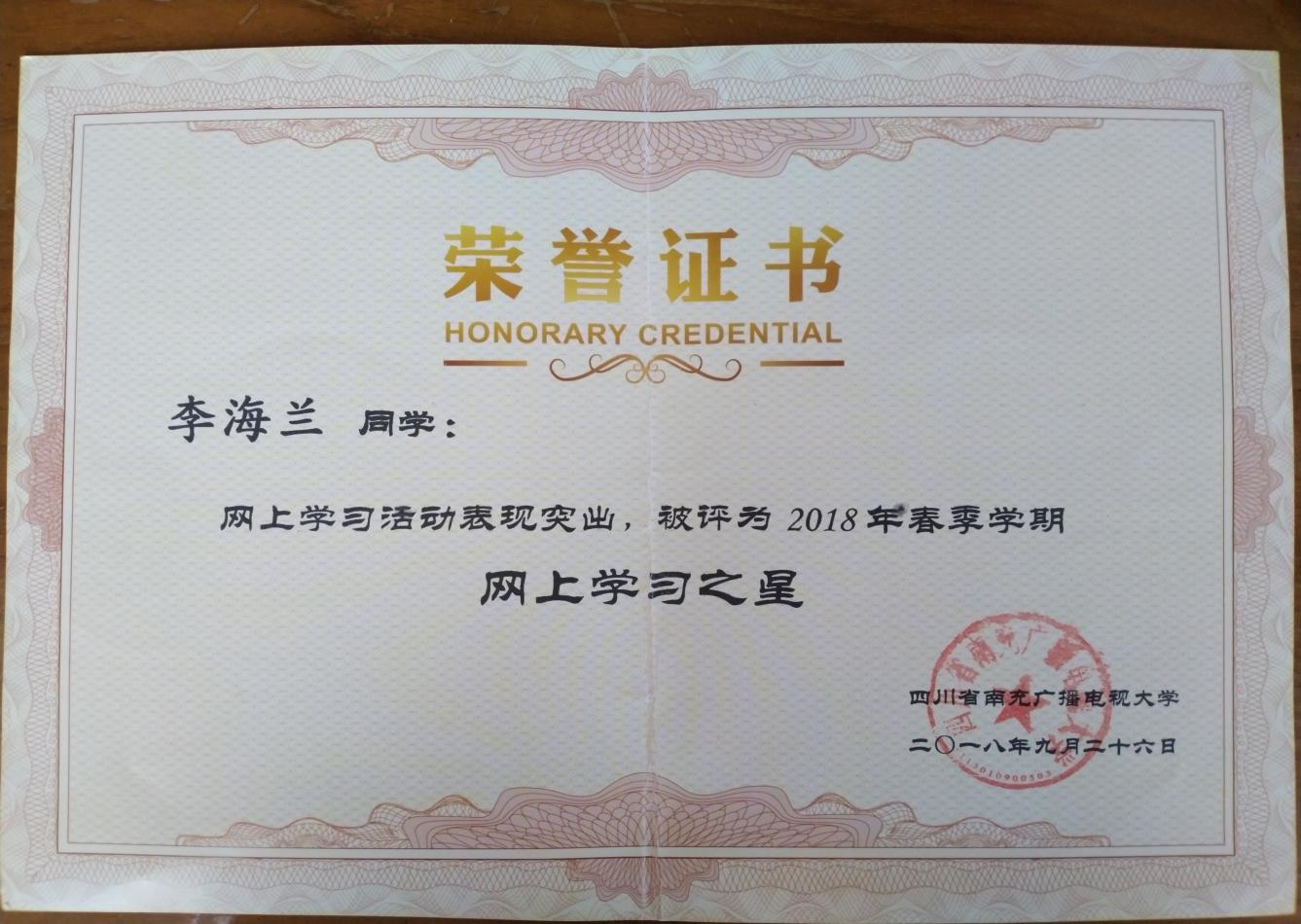 2018年9月李海兰荣获网上学习之星