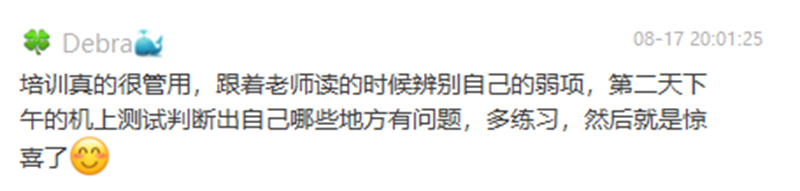 三是培训老师为每一期的学员建立了学习交流群,老师会在群里开展课后指导,在正式测试前进行强化训练,让学员们保持良好状态迎接正式测试,这对学员取得理想的测试等级大有裨益。