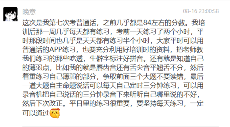 “我也过啦!这是我第七次考普通话,之前几乎都是84分左右的成绩,没想到这次进步这么大,谢谢开放大学的老师们,爱你们!”