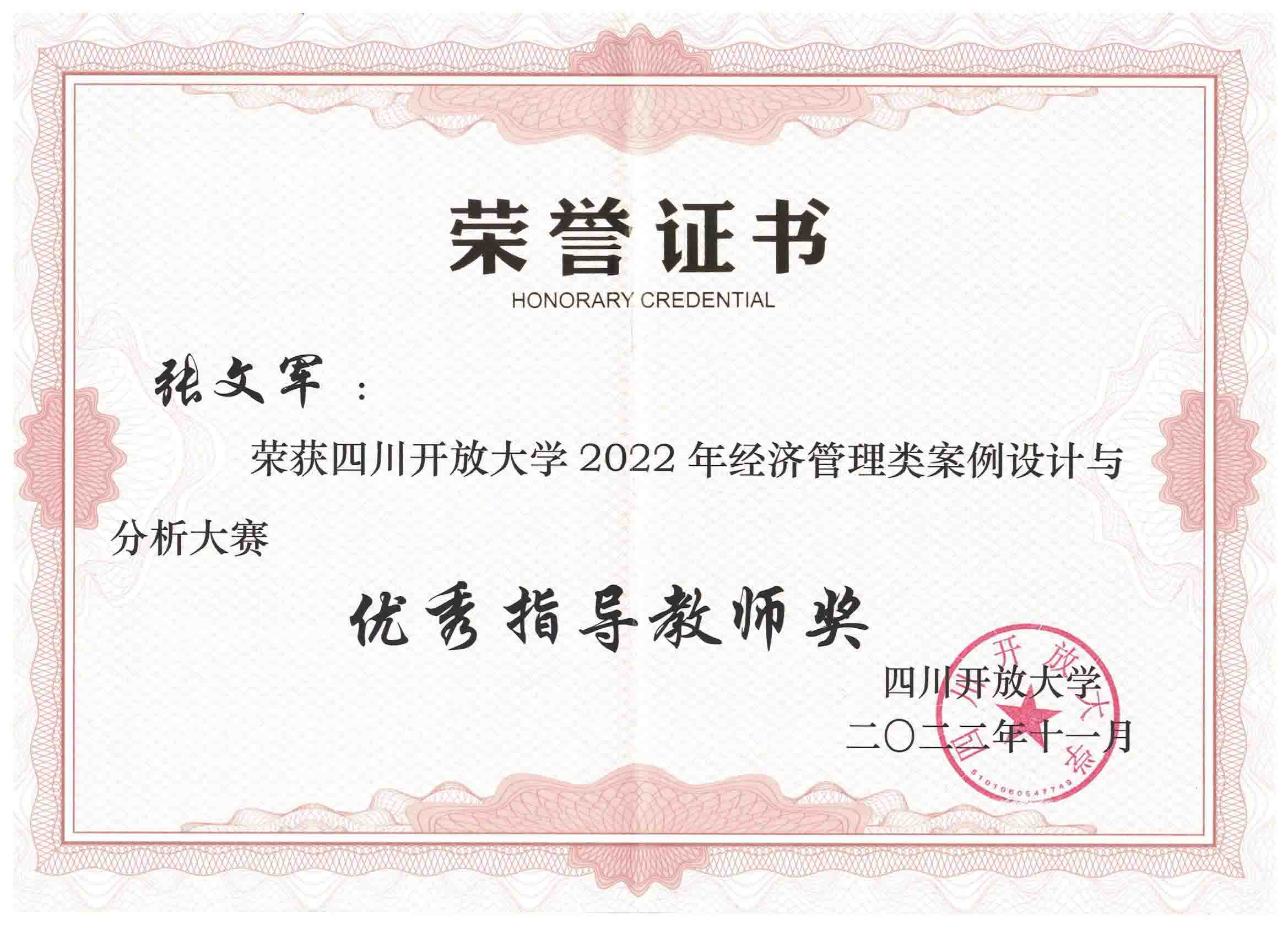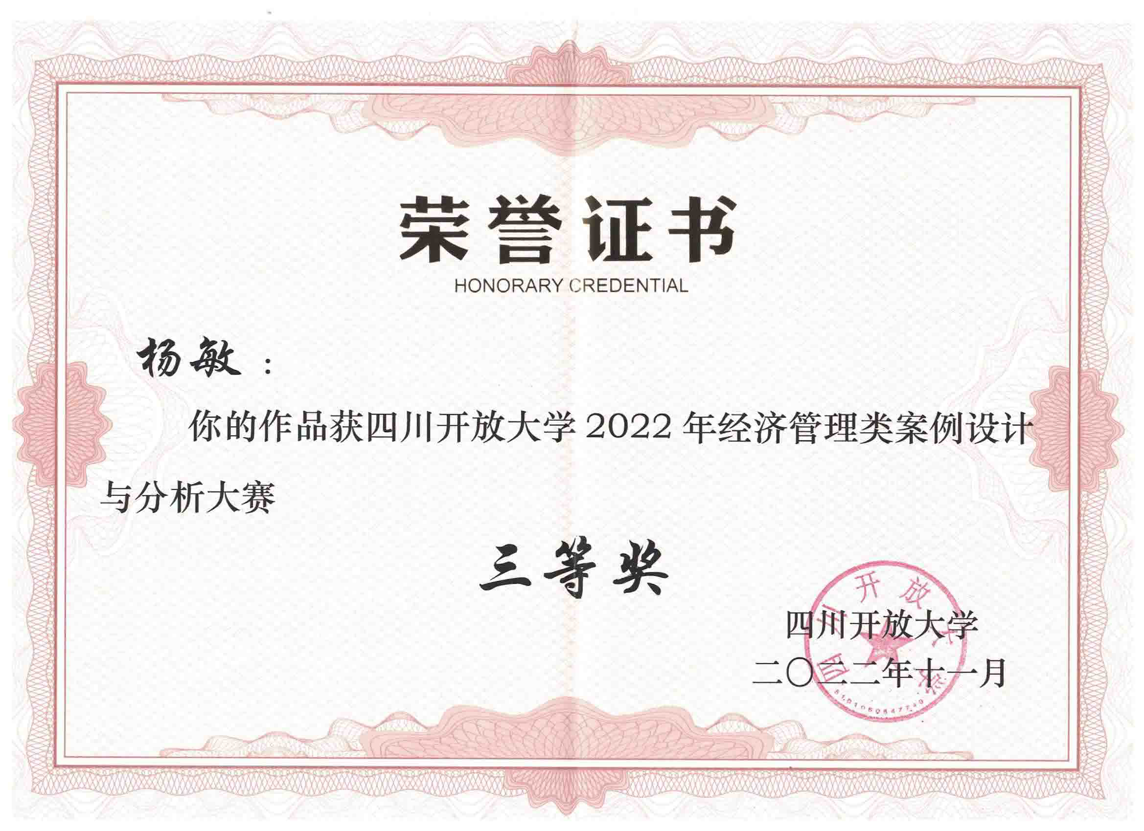 近日,四川开放大学组织的全省开放大学系统经济管理类案例设计与分析大赛评选结果出炉,我校2021年春季工商本科杨敏的作品《中小民营企业内部控制案例分析》(指导教师:张文军)荣获三等奖,张文军荣获“优秀指导教师奖”。