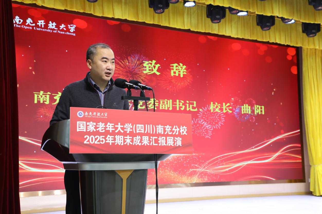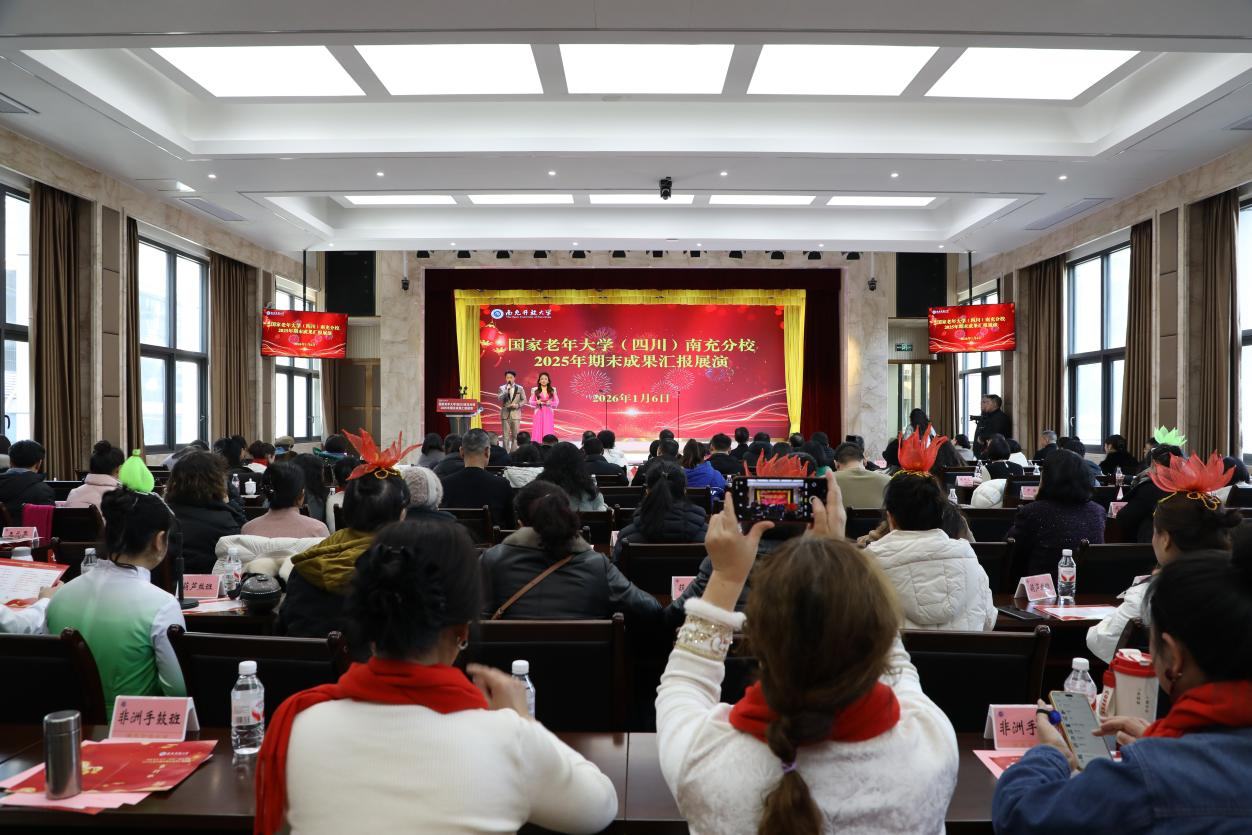 1月6日,国家老年大学(四川)南充分校2025年秋季学期期末成果汇报展演在南充开放大学多功能厅圆满落幕。南充市教育和体育局、西华师范大学离退休处、南充市老干部活动中心、顺庆区老年大学、顺庆区直属教学点及各县(市、区)分校相关负责人,学校领导班子成员、全体教职工、老年教育授课教师与参演学员齐聚一堂,共赏学习成果,共品银龄芳华。
