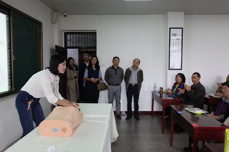 学校党委书记、校长昝平,市委教育工委专职副书记胡良华、教体局职成科副科长任宗祥、副校长王旗等陪同调研组一行观看了我校近几年开展社区教育、老年教育的宣传展架、视频图片和正在409教室举行的急救知识培训(第3期),昝校长并就有关工作与调研组交换了意见。来自花园坝、柳林路社区的近50名居民参加了这次培训。