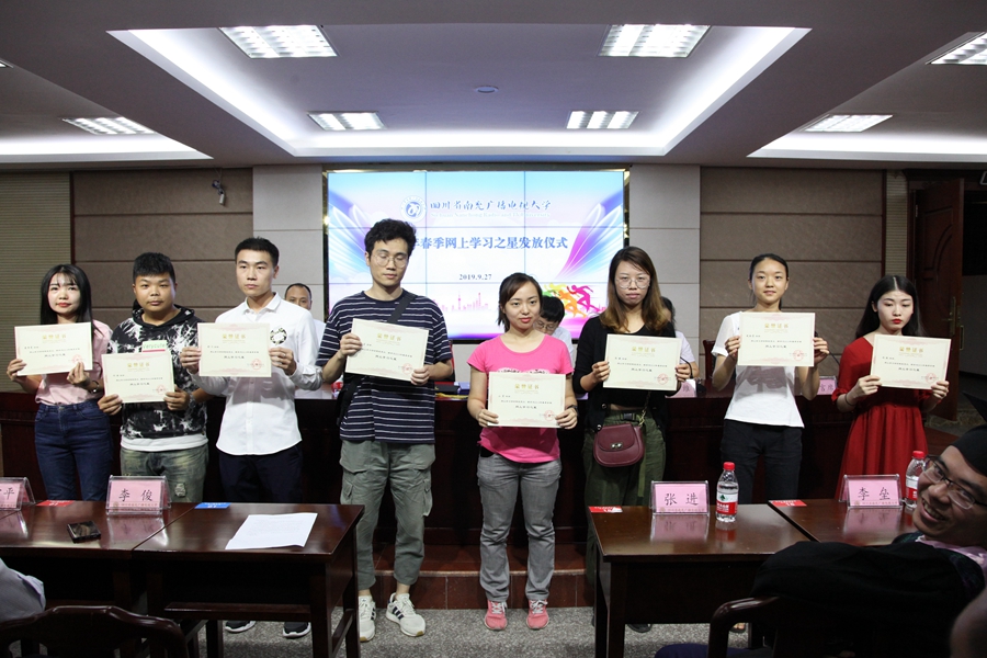 开学典礼在庄严的中华人民共和国国歌声中正式开始。典礼上,播放了四川电大为庆祝建国70周年由各市州电大拍摄的“我和我的祖国”主题拉歌视频和尹析明校长《致新生辞》,向2019届取得学士学位的学生授予了学位证书,表彰了南充电大2019年春季“网上学习之星”,并分别发放了500元至1000元奖金。教务处处长游华奎为新生上了第一课,深入浅出对《入学指南》作了讲解,以帮助新生更好地明白在电大“怎么学”“怎么考”。