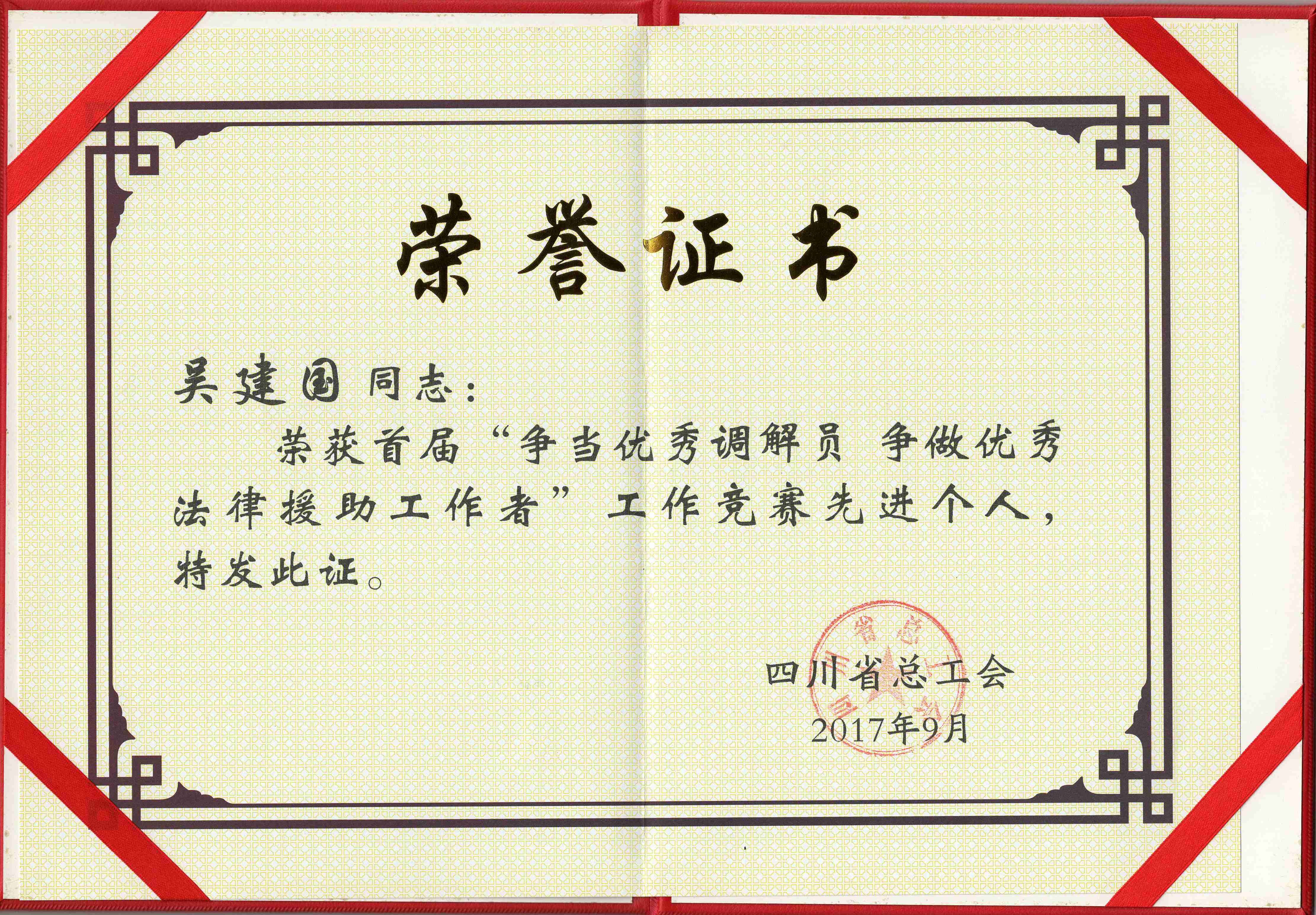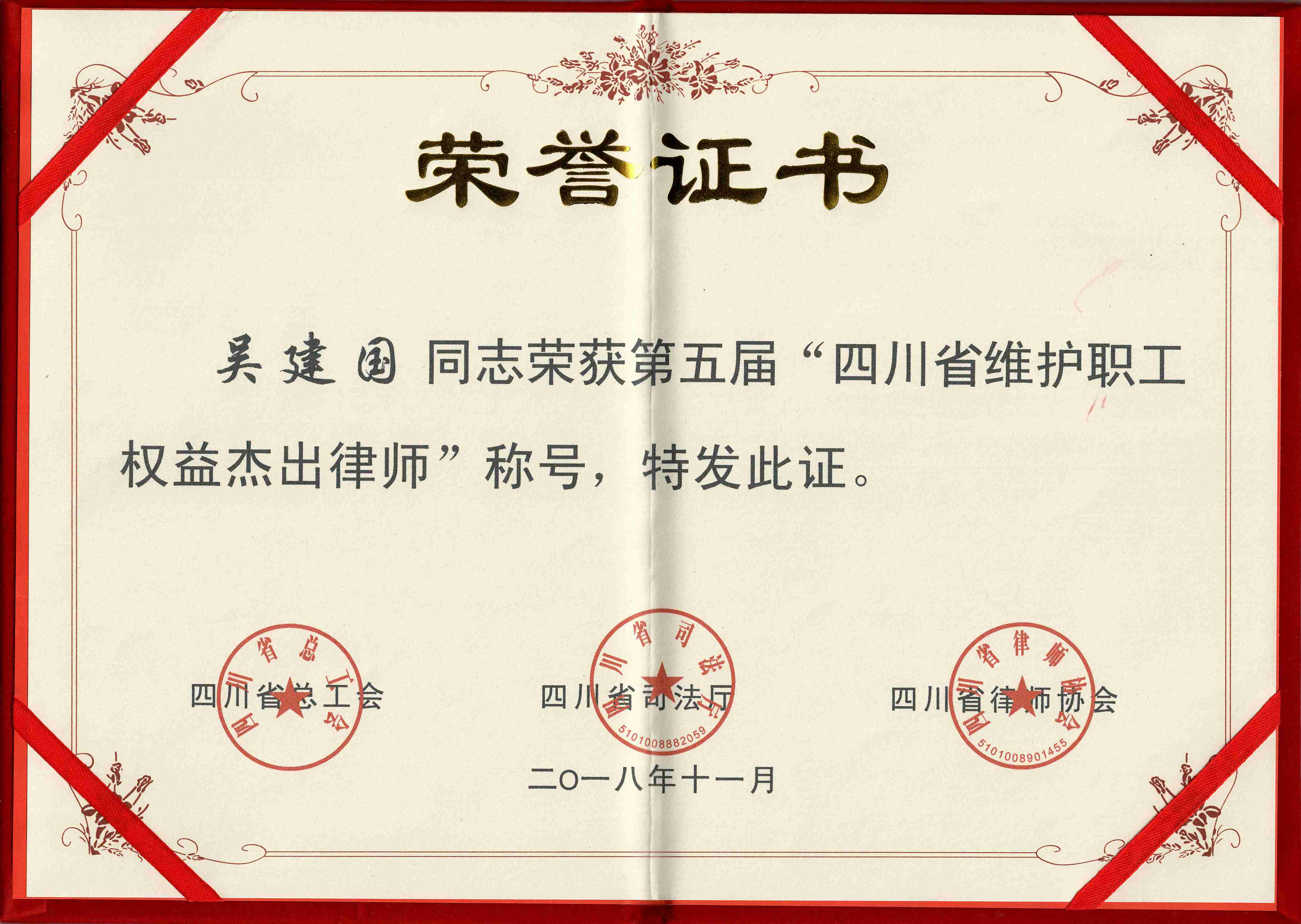 因为他的杰出表现,2018年11月四川省总工会授予四川省五一劳动奖章荣誉称号、第五届四川省维护职工权益十大杰出律师荣誉称号。在南充能获得此项殊荣的确实为数不多。数十家媒体报道了他的先进事迹。不仅如此,他的个人事迹已入编高坪区党史研究室和入编高坪区人民政府2019年出版的首战新高地———南充市高坪区2018年工作全纪录。