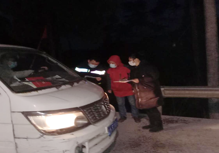 屈仁娟(右)晚上坚持排查进出车辆和人员