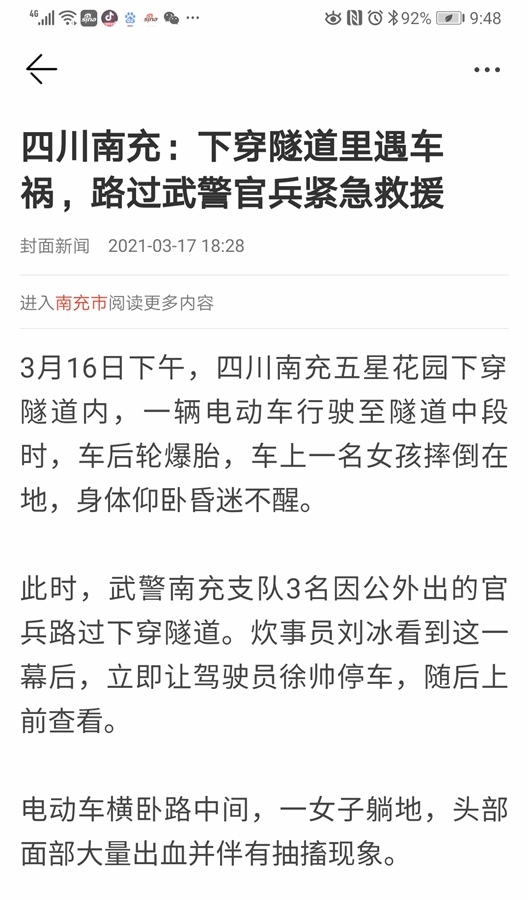 据四川报业集团《封面新闻》报道,3月16日下午,南充广播电视大学2019秋季法学班的刘冰(武警南充支队战士)和战友因公外出,路过四川南充五星花园下穿隧道时,看到一名女孩因电瓶车爆胎摔倒在地,身体仰卧、昏迷不醒,看到这一幕后,刘冰立即让驾驶员徐帅靠边停车,开启车辆双闪,在事故前方设立三角警示架,拨打急救电话后迅速展开对女孩的抢救。时间就是生命,在刘冰等人的有效帮助下,女孩避免了二次伤害,成功等到救援。