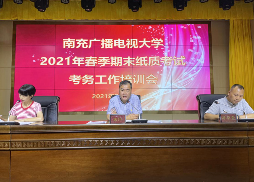 为保证2021年春季期末纸质考试工作的顺利进行,严格规范监考工作程序,2021年7月9日下午,南充开放召开了2021年春季期末纸质考试考务工作培训会。副校长曲阳、教务处处长游华奎、教务处副处长任璘及全体考务、监考人员共计108人参加了会议。会议由教务处副处长任璘主持,副校长曲阳出席并讲话。