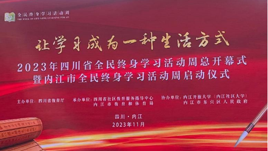 11月27日上午,2023年四川省全民终身学习活动周总开幕式在内江隆重举行。活动周以“让学习成为一种生活方式”为主题,旨在引导和推动全省各地广泛开展学习活动。省委教育工委副书记、教育厅党组成员、副厅长崔昌宏,省开放大学党委书记杨俊辉出席开幕式,内江市委、市政府有关领导和来自各市(州)教育部门分管领导和科室负责人、各市(州)开放大学(社区大学)社区教育负责人、“百姓学习之星”和“终身学习品牌项目”代表、社区居民代表共500余人参加了开幕式。