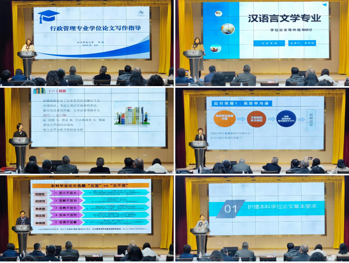 随后,万鸿、吴玲玲、李云捷等专家教授分别就行政管理、汉语言文学、法学、护理等专业学位论文指导过程各个环节进行了专题培训。
