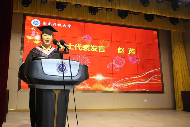 在学位颁授环节,杨震与曲阳共同为获得学士学位的代表逐一拨穗正冠、颁授证书并合影留念。学士代表赵芮同学现场分享了她的学习经验与人生感悟,为新生提供了宝贵借鉴。